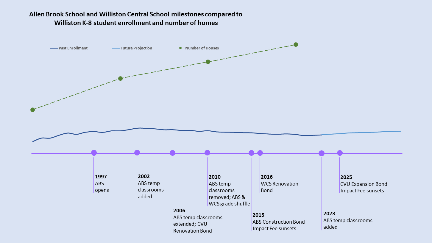 Factors affecting school enrollment are complex and intertwined, and enrollment trends cannot reliably be predicted by any one factor. Policies in previous Town Plans have emphasized the need for the Town to manage growth "in a way that is consistent with the capacity of the schools." Because school enrollment is influenced by a myriad of factors including the growth of new homes, the policy of shaping land use decisions primarily to control school enrollment should be revised. Williston can continue to grow its stock of homes without exceeding the capacity of the schools. School Taxes are Increasingly Burdensome