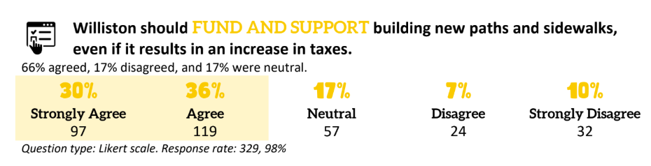 - 66% of people think that Williston should fund and support the building of new paths and sidewalks, even if it increases taxes.